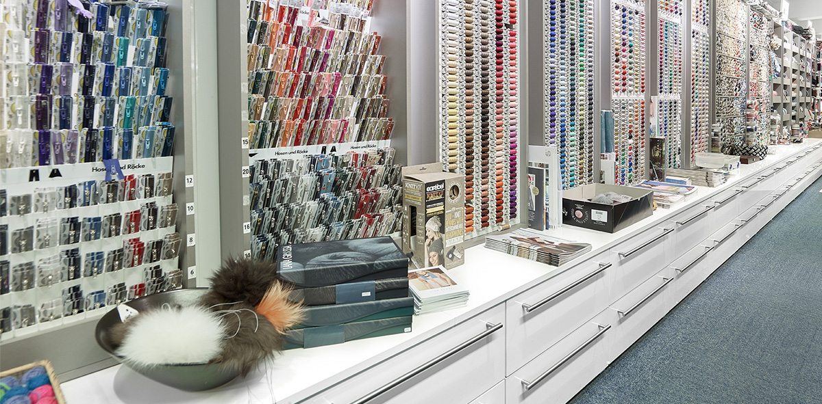 Reißverschlüsse, Garne, Bänder und was immer in ein Modewarengeschäft gehört: Wir setzen Sie perfekt in Szene und liefern den Inhalt gleich mit. Unsere Unternehmens-Schwester „Rosink Objekteinrichtungen“ setzt die Konzepte, Herstellung und Montage um. Ihr VENO Spezialist plant mit Ihnen zusammen die Verkaufsplätze, Sortimente und wichtigen Themenwelten vor Ort. Optik, Oberflächen oder Einzelmodule sind dabei immer flexibel und individuell umsetzbar.